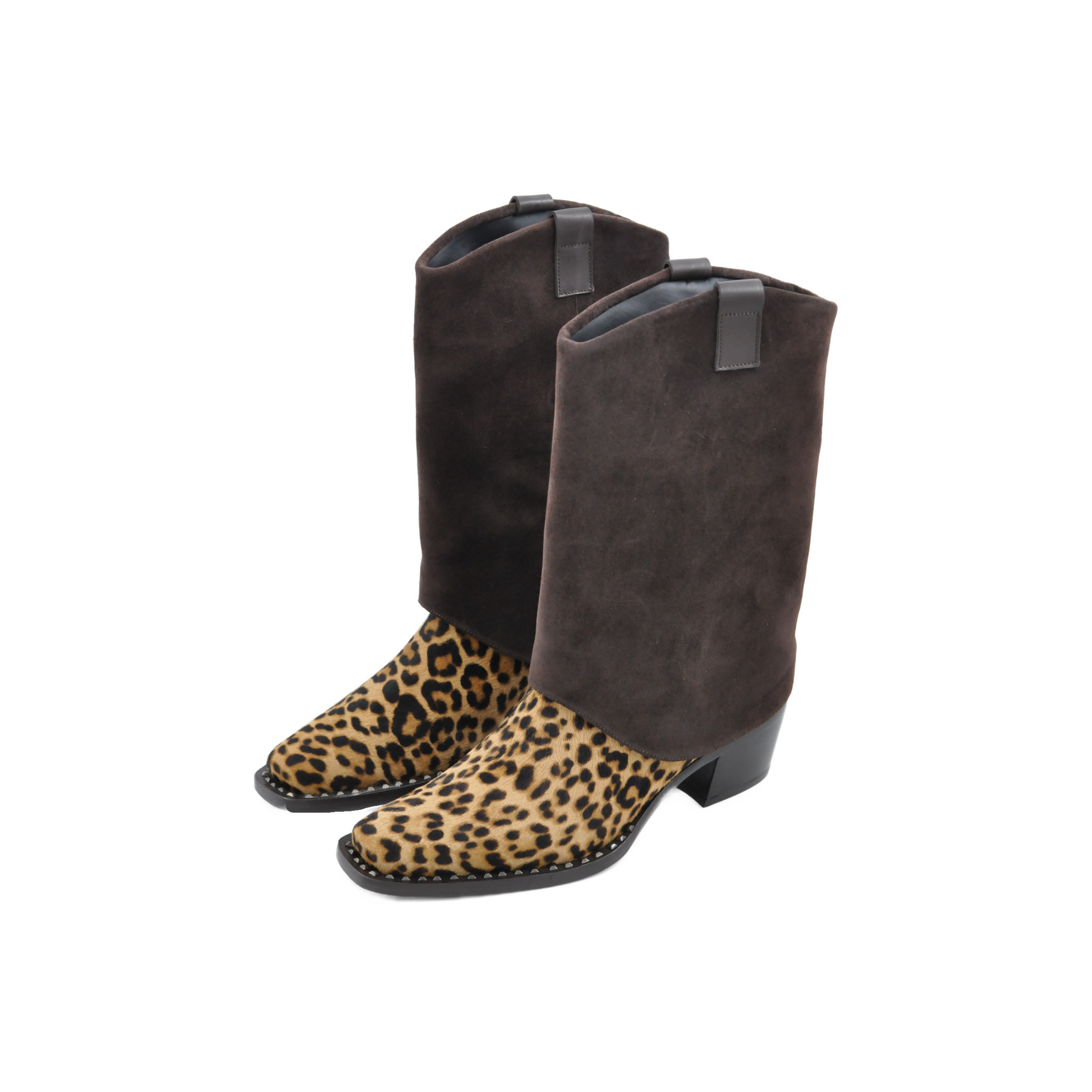 Botki marki Pons Quintana stylizowane na kowbojki, wykonane z wysokiej jakości zamszowej skóry w modnym princie panterki w odcieniach beżu i brązu. Cholewka z brązowego zamszu ma nieco szerszy krój, co ułatwia zakładanie i zapewnia wygodę. Wokół podeszwy znajdują się ozdobne ćwieki, podkreślające unikalny charakter modelu. Podeszwa skórzana, a wnętrze wykończone czarną skórą gwarantują najwyższy komfort noszenia.