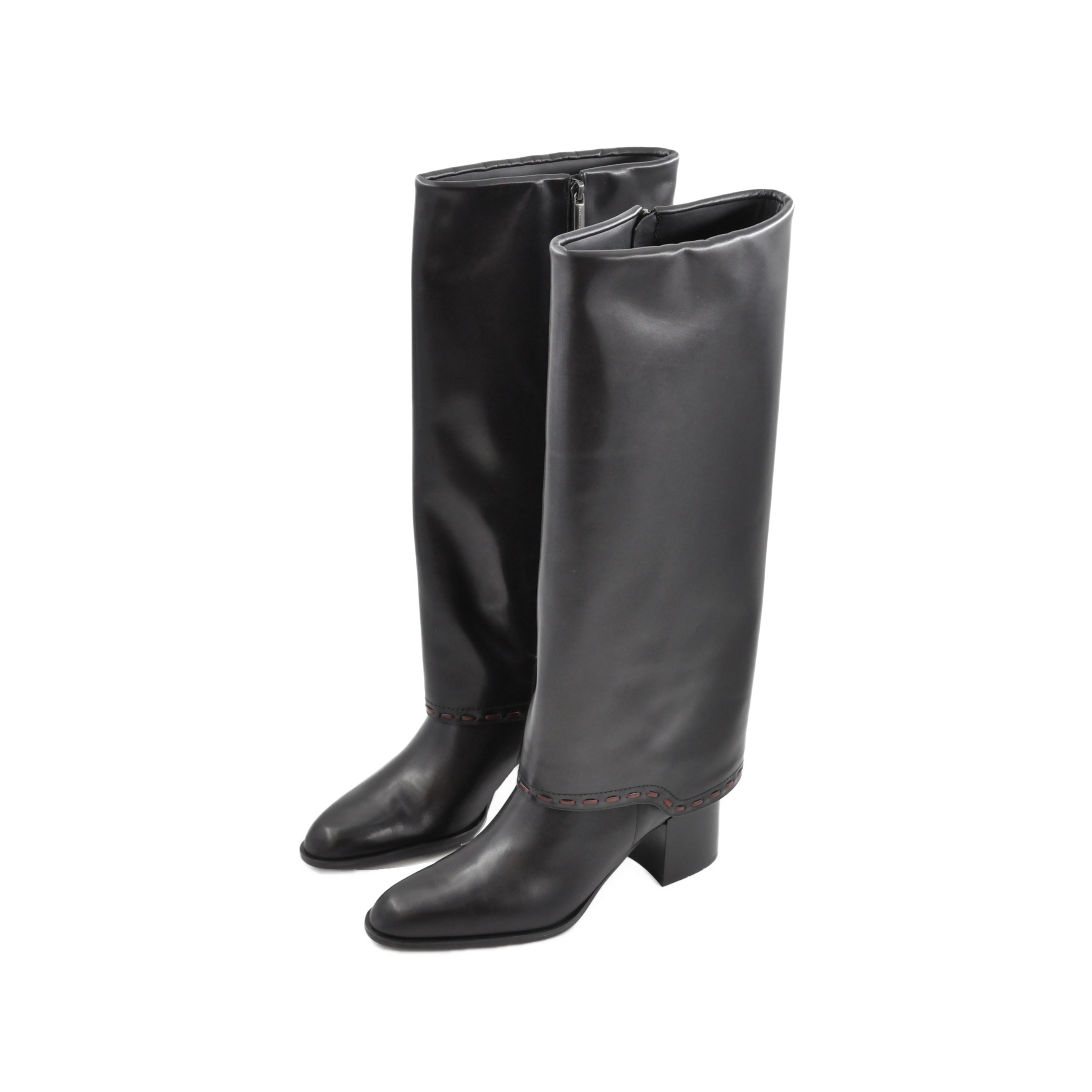 Kozaki marki Pons Quintana wykonane z wysokiej jakości skóry licowej w klasycznej czerni. Wykończone eleganckim ozdobnym szyciem w kolorze bordowym, z boku praktyczny zamek. Obcas klockowy o wysokości 6 cm zapewnia wygodę i stabilność podczas noszenia, łącząc styl i komfort w codziennych stylizacjach.